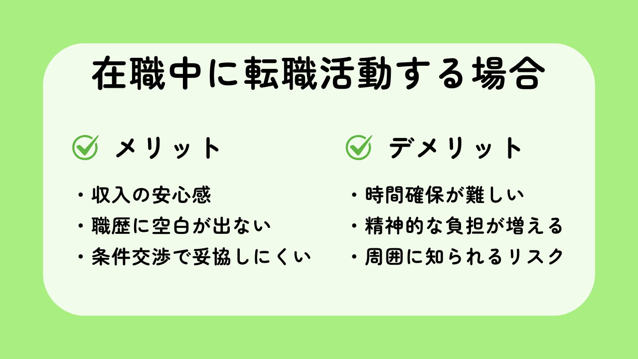 ・収入が途絶えない安心感:最大のメリットは、収入が確保されていることです。経済的な不安がないため、精神的に余裕を持って活動でき、「早く決めないと」という焦りから妥協してしまうリスクを減らせます。