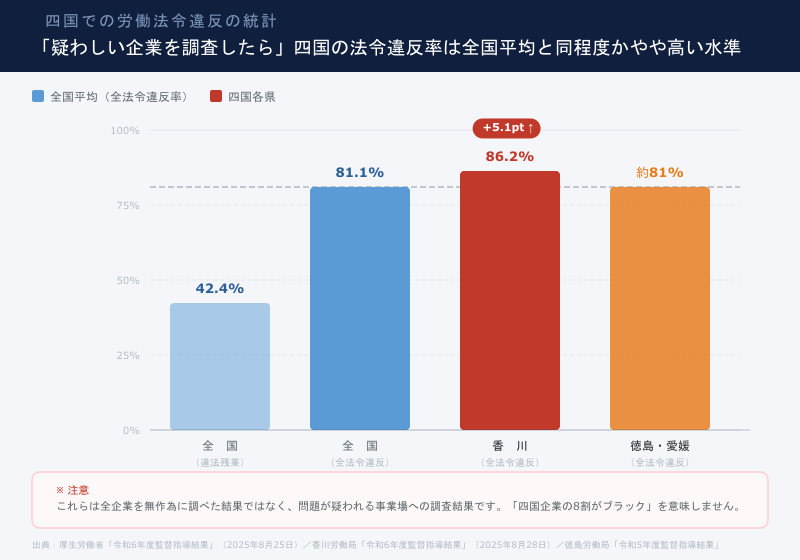 香川労働局の令和6年度調査では、調査対象181事業場のうち156事業場(86.2%)で法令違反が確認されています。この86.2%を比較する全国平均は、同じ「全法令違反率」の全国値である81.1%です(前段の42.4%とは別の指標です)。徳島労働局の令和5年度調査でも281事業場のうち8割超で違反が認められており、愛媛も同様の傾向が続いています。