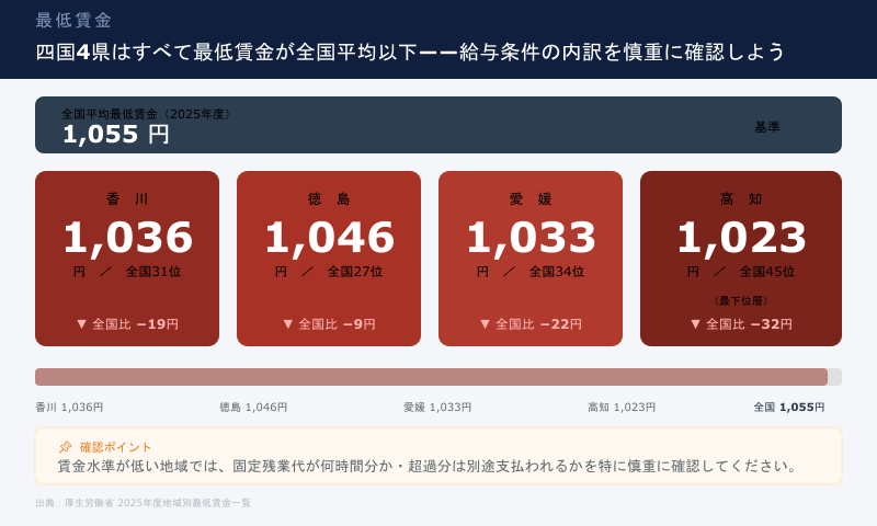 - ・四国4県はすべて最低賃金が全国平均以下。給与の内訳・固定残業代の時間数は特に慎重に確認する