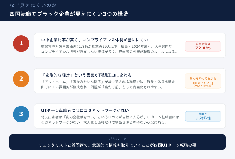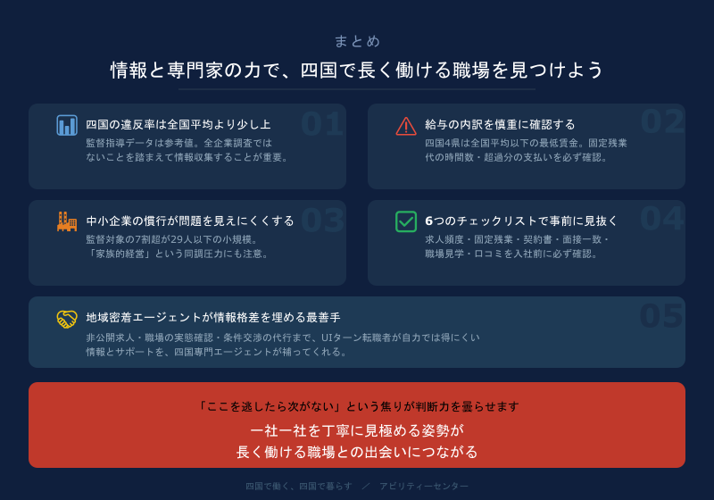 - ・四国だけ特別にブラック企業が多いという統計はない。ただし中小企業比率が高く、UIターン転職者は情報収集が難しいという構造的な特徴がある