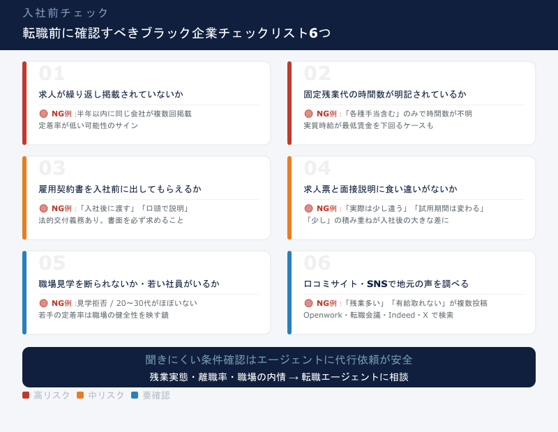 次の6点を入社前に確認することをおすすめします。①求人が繰り返し掲載されていないか、②固定残業代の時間数が明記されているか、③雇用契約書を入社前に提示してもらえるか、④求人票と面接説明に食い違いがないか、⑤職場見学で若い社員がいるか・見学を断られないか、⑥口コミサイト・SNSで地元の声を調べているか。