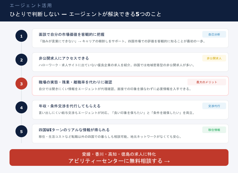 - ・地域密着エージェントの活用が、四国転職の情報格差を埋める最も確実な手段