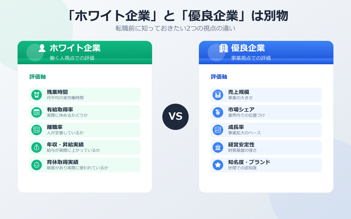 - 「ホワイト企業」=残業・有給・離職率・年収など働く人視点の指標で判断する