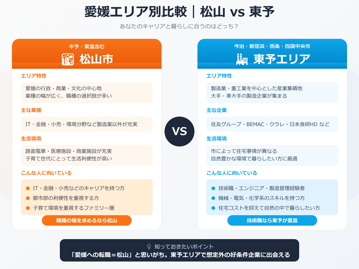 「愛媛への転職=松山」と思い込んでいる方ほど、東予エリアを調べることで想定外の好条件企業に出会えるケースがあります。